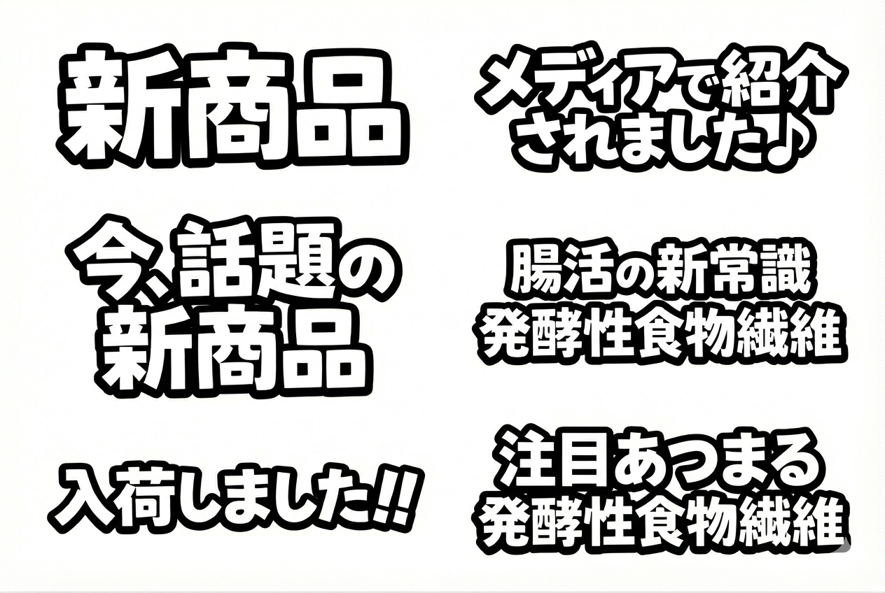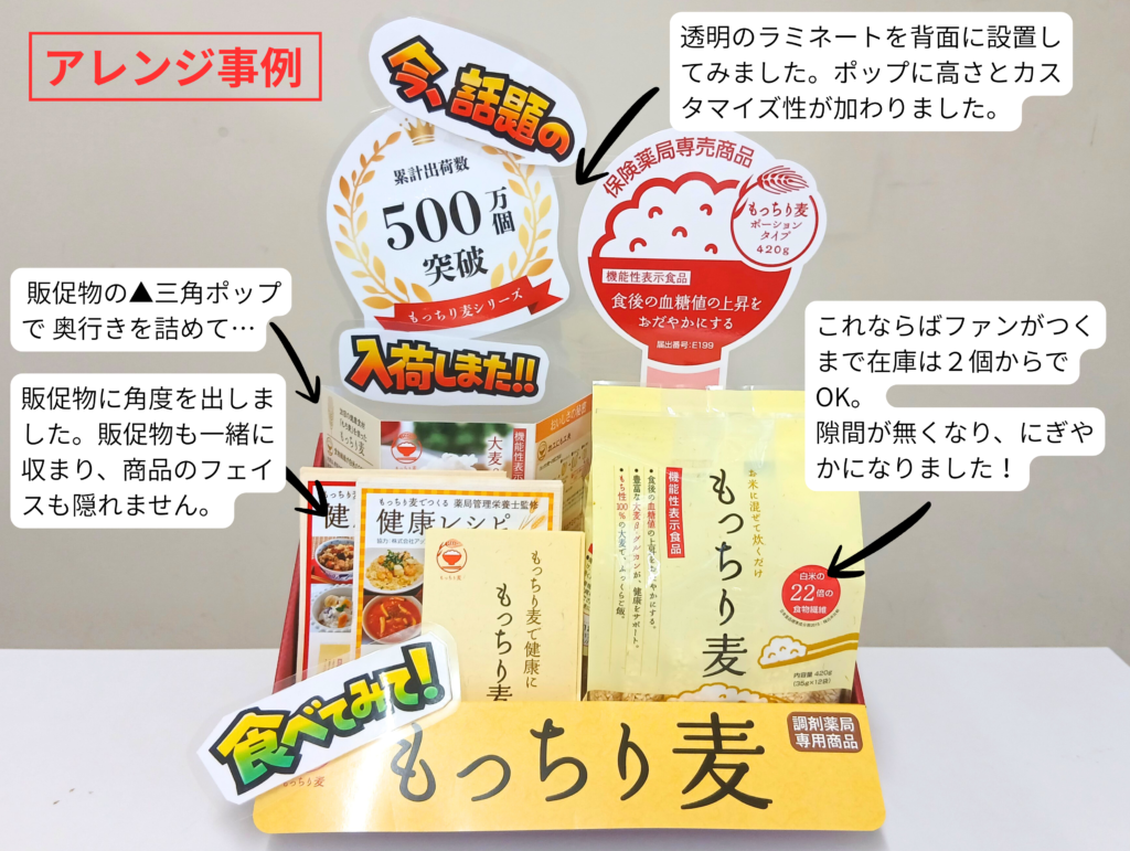 メーカーの販促物やPOPを少し追加するだけで、売場の印象は大きく変わります!組み合わせやレイアウトは各店舗様次第です。